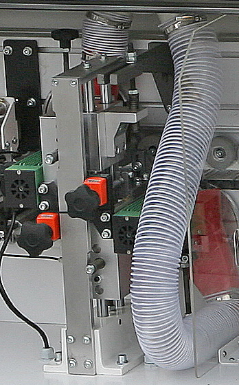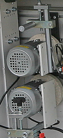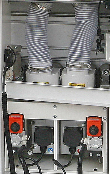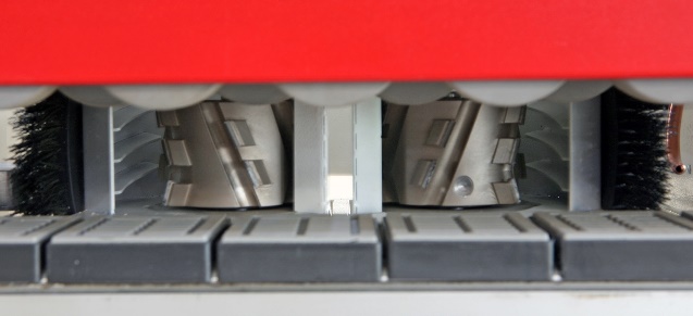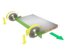 Два промышленных двигателя (12000 об/мин), 2 x 0,37 кВт Две пилы Ø80 х Ø22, Z=20 Пилы перемещаются по одной призматической направляющей, где каждая пила отрезает припуск только с одной стороны. Данная система зарекомендовала себя, как надежная и стабильная, в течение всего срока эксплуатации. Отличительные особенности: