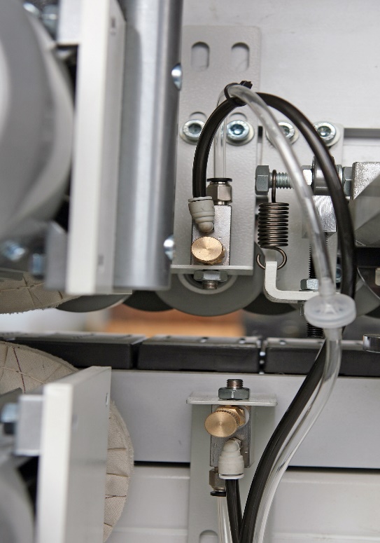 ПОДАЧА ОХЛАЖДАЮЩЕЙ ЖИДКОСТИ Узел очищающей жидкости, расположен перед узлом полировки и предназначен для устранения следов клея, потёков, пыли как на стандартных, так и деликатных поверхностях. 2 форсунки одновременно наносят жидкость сверху и снизу заготовки. Регулировка подачи необходимого количества жидкости. Улучшает качество обработанной детали и обладает антистатическим эффектом. |