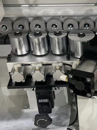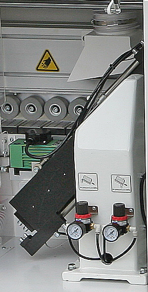 ПРЕСС ГРУППА Состоит из одного ведущего ролика и трех до прессовочных роликов, которые обеспечивают надежную фиксацию кромочного материала на торец заготовки. На каждом ролике установлен отдельный пневмоцилиндр. 2 ролика из 4-х роликов имеют разный конус, что обеспечивает распределение усилия прижима по толщине детали. Давление на пресс группе задается с помощью пневматики, что гарантирует равномерное распределение усилий на кромку во время приклеивания. |