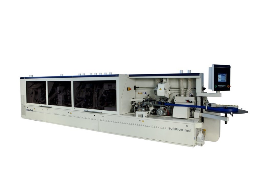 Автоматический односторонний кромкооболицовочный станок для приклеивания кромки при помощи горячего клея-расплава на прямолинейные щитовые детали с четырех сторон с последующей финишной обработкой и скруглением углов