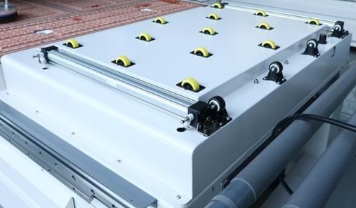 Оснащена группой роликов для бережного перемещения плит , а так же пневмотолкателями для автоматической базировки материала на рабочем столе.