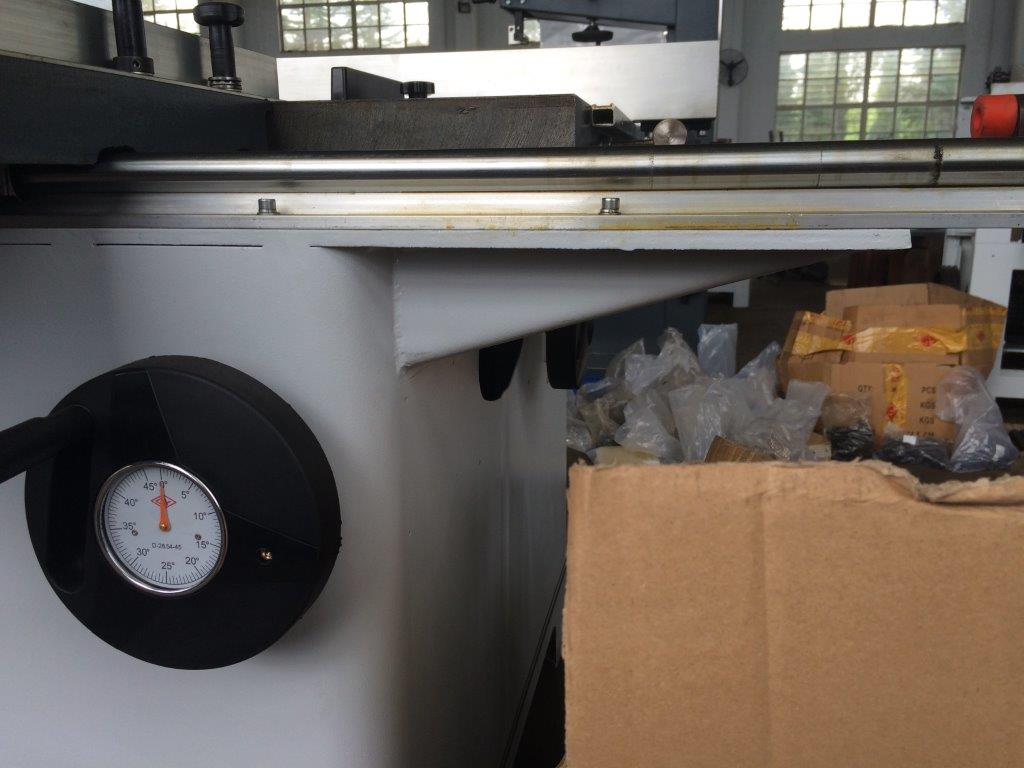 Параллельный упор для раскроя по ширине Для раскроя по ширине используется параллельный упор с миллиметровой шкалой, перемещение упора по массивной цилиндрической направляющей, для стабильности выставленного размера снабжен фиксирующим винтом.  |