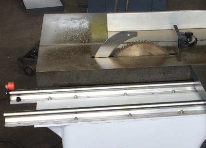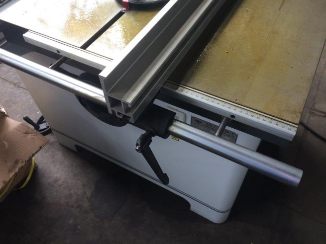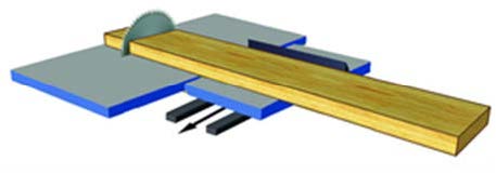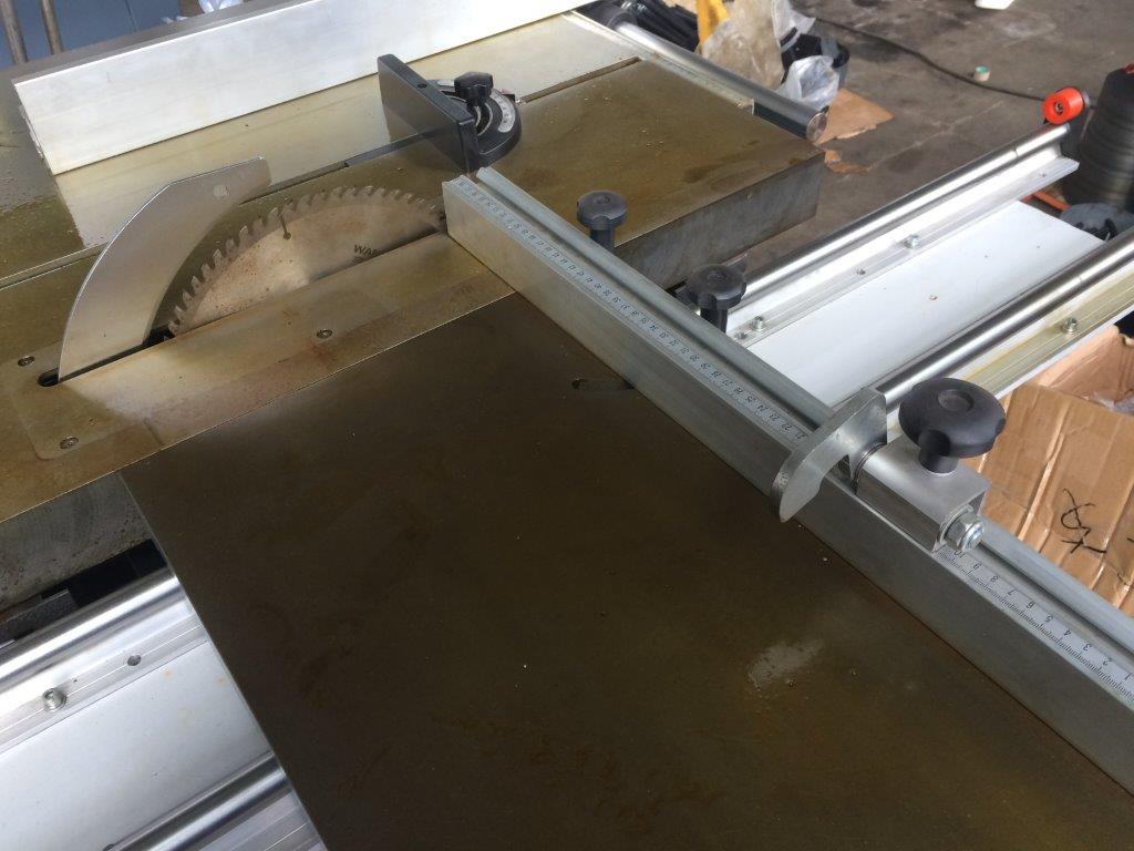 Параллельный упор для раскроя по ширине Для раскроя по ширине используется параллельный упор с миллиметровой шкалой, перемещение упора по массивной цилиндрической направляющей, для стабильности выставленного размера снабжен фиксирующим винтом.  |