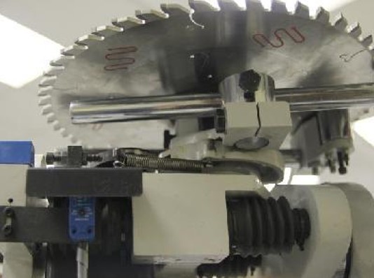 Максимальный шаг зубьев 100 мм. Также конструкция толкателя позволяет регулировать положение толкающего штифта относительно зубьев затачиваемой дисковой пилы |